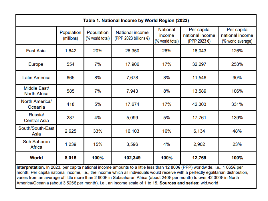 Before diving deeper into Piketty’s arguments, I want to take a moment to reflect on one particular table I encountered during my reading. Piketty is one of the driving forces behind the World Inequality Database (WID), which compiles and publishes historical data on income and wealth distribution. I found a striking chart in one of their recent reports, and I’d like to use it as a springboard to think about the emerging global order.
